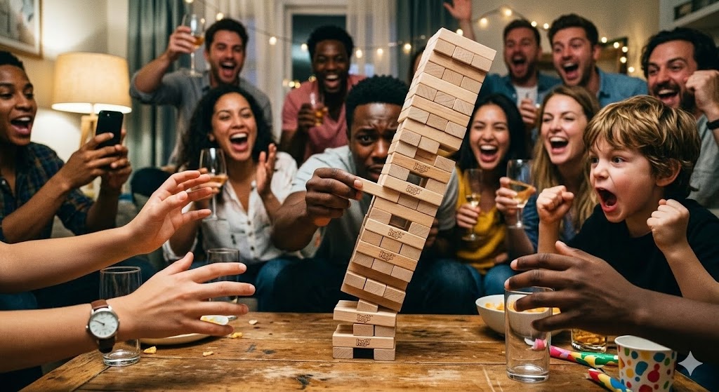 | Aikuiset | Sosiaalinen, usein illanistujaisissa. | Jenga Giant tai itsetehdyt tehtäväpalikat. |